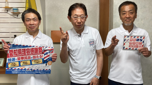 【市民伝言板 8月12日(土) 9:55~初回放送】 本日は、1組の方にミクスのスタジオにお越しいただき、 市民伝言板の収録を行いました! 岡崎理容組合のみなさんです! 8月1日から始まっている「愛知県理容感謝祭」の案内をしてくださいました。 情報満載の市民伝言板をチェックして いろいろな所に遊びに行ってくださいね~(^^)ノ 放送をお楽しみに~!!(^^♪