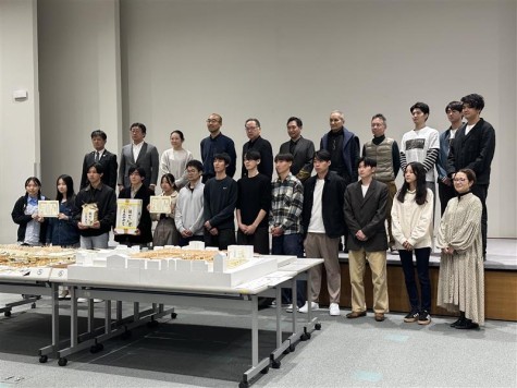朝日町にある福祉会館で15日、岡崎市産木材を活用した学生・建築デザインコンペティション2025の公開審査会と表彰式が行われました。この日、ポスター審査の一次審査を通過した4グループと、建築の専門家など7人の審査員が参加し、学生によるプレゼンテーションや建築模型をもとに、審査員が疑問点を学生に質問しながら審査が進められました。そして、今回、最優秀賞作品に選ばれたのは、春日井市にある中部大学の学生2人によるグループが制作した「あそびのカサナリ」です。