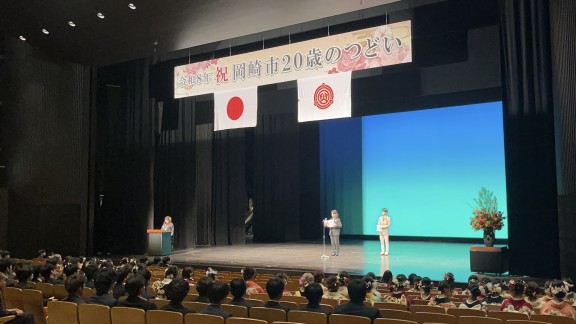 六供町にある岡崎市民会館と、20の市立中学校で11日、「令和8年 岡崎市20歳のつどい」が行われました。今年は平成17年4月2日から平成18年4月1日に生まれた3614名が20歳の節目を迎え、出身中学校ごとに分散して式典が行われました。岡崎市民会館では、代表者が「20歳の言葉」を述べ、出席者は20歳になった事を実感し、気を引き締めていました。また自主企画では、味噌六太鼓会による演舞が行われ、新成人のハレの日を盛大に祝いました。