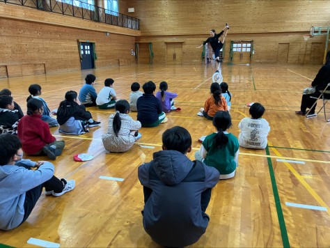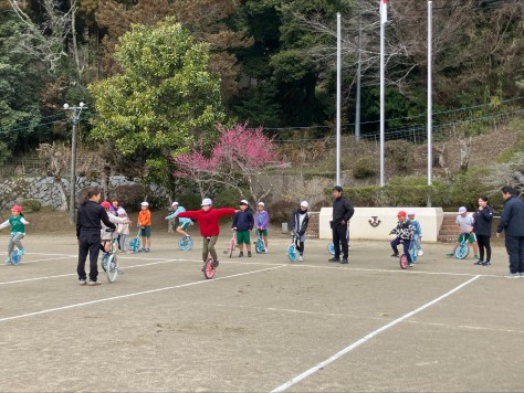 下山小学校で2月27日、「一輪車元世界王者 髙田朝日さんによる夢講座」が開催されました。下山小学校では、毎年5月の運動会で全校児童による一輪車演技を披露しています。今回は、児童が一輪車でできることを増やすことや、目標に向かってあきらめない気持ちを学んでもらおうと開催されました。講座ではまず、一輪車世界大会で優勝経験のある髙田さんの演技披露が行われ、その後運動場に移動し、児童に一輪車の指導を行いました。