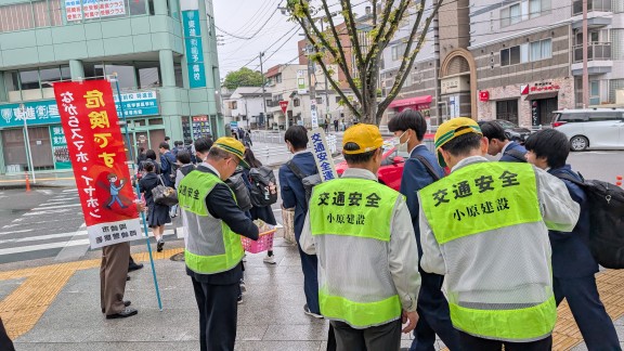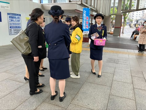名鉄東岡崎駅南口で15日、名鉄観光バス株式会社のガイドらによる交通安全キャンペーンが行われました。このキャンペーンは、交通従業員として働くバスガイドからの呼びかけを通して、地域住民に交通安全への意識を高めてもらおうと、春の全国交通安全運動の一環として行われました。この日、名鉄観光バス株式会社のバスガイドをはじめ、岡崎警察署員など、合わせておよそ40人がキャンペーンに参加。東岡崎駅を利用する地域住民に啓発品の配布を行いました。