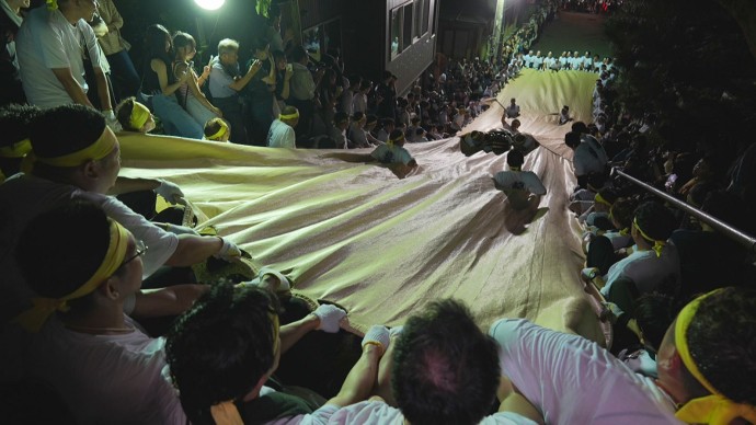 大提灯を町一体で掲げ、提灯の灯とともに祭りを未来へ繋ぐ人々を伝えます。