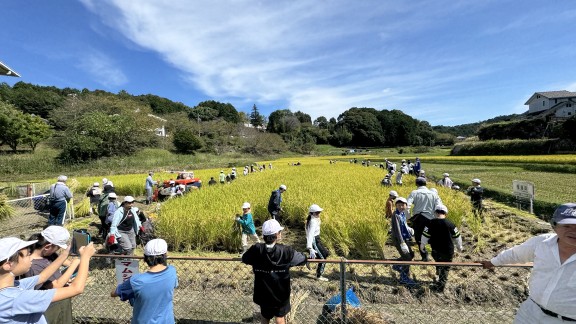 田口町にある常磐南小学校の学校田で8日、児童による稲刈りが行われました。常磐南小学校では、5年生の社会科の授業の一環として毎年地域の人たちと交流しながら稲を育てており、この日も地域の農業に携わる人たちのサポートを受けながら収穫作業に取り組みました。
