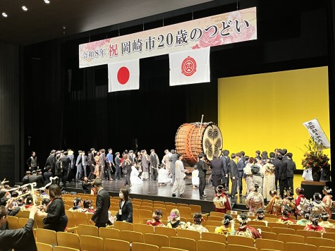 六供町にある岡崎市民会館と、20の市立中学校で11日、「令和8年 岡崎市20歳のつどい」が行われました。今年は平成17年4月2日から平成18年4月1日に生まれた3614名が20歳の節目を迎え、出身中学校ごとに分散して式典が行われました。岡崎市民会館では、代表者が「20歳の言葉」を述べ、出席者は20歳になった事を実感し、気を引き締めていました。また自主企画では、味噌六太鼓会による演舞が行われ、新成人のハレの日を盛大に祝いました。