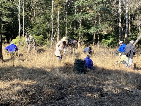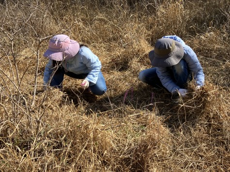 保全作業体験として湿地の草刈りが行われ、参加者は、ハルリンドウの葉などに印をつけながら、かまを使って一生懸命に草を刈っていました。