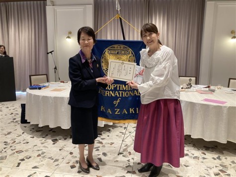 竜美西2丁目にあるサンフィレール岡崎で19日、女性の奉仕団体 国際ソロプチミストによるリジョナルプロジェクト「大学女子学生・専門学校女子学生支援金」2025年度 クラブ賞贈呈式が行われました。今回、岡崎市内の大学、専門学校に通う2名が選ばれ、賞状と金一封が贈られました。また、『ドリーム賞』クラブ賞贈呈式も行われ、名古屋市在住の書道家 矢野きよ実さんへ賞が贈られました。