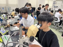 自然科学研究機構基礎生物学研究所で5日、サイエンス実践塾体験研究室が行われました。これは、愛知県で次世代を担う高校生に研究開発施設での実習体験や施設見学、理工系大学生や技術研究者との交流を通して、将来の理工系キャリア形成のビジョンを考える機会を設けようと、愛知県産業科学技術課の主催で、2022年から毎年実施しています。今回、自然科学研究機構基礎生物学研究所では、「プラナリア・イモリの再生から再生医療を学ぶ」をテーマに講義や実習を行いました。参加者は講義の後、実際にプラナリアを顕微鏡で観察しました。その後メスを使い三等分に切り、再生時の断面や様子を顕微鏡でのぞきながら観察し、最先端の科学技術を間近で学んでいました。 -