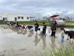 中島町にある地域交流センター六ツ美分館で17日、食育イベント「田植え体験」が行われました。これは、岡崎市学校給食協会の食育推進活動の一環で毎年行われています。イベントでは、米作りについて学んだ後、地域交流センター六ツ美分館の横にある田んぼに移動し、田植えを体験した。参加者は、800㎡の田んぼに、横一列に並び、泥に足を取られ悪戦苦闘しながらも「あさひの夢」という品種の稲を手植しました。 -