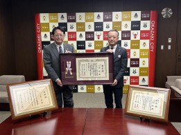 23日、交通安全及び防犯活動における各章を受章した小原睦さんが市役所を訪れ、市長へ受章を報告しました。小原さんは、令和7年度交通安全功労者表彰式において『交通安全功労者表彰」、令和7年全国地域安全運動中央大会において『防犯栄誉金賞」、第66回交通安全国民運動中央大会において、『交通栄誉章緑十字金章』を受章しました。内田市長は報告を受け、「引き続き交通安全活動への協力をお願いしたい」と話していました。