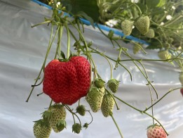でかほっぺは、60グラム以上の重さの紅ほっぺで、2番果の生育時期である1月にできはじめ、ひとつの苗から一粒できるかできないかという希少ないちごです。