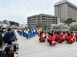 乙川河川敷周辺で5日、「第18回どまつり夜桜in岡崎」が開催されました。これは、東海地区のよさこいチームが日頃の練習成果を披露する場として毎年行われているイベントです。会場は乙川河川敷、岡崎城公園、桜城橋の3か所で、各チームの特色を生かした踊りが披露されました。この日、桜城橋では長さ約40メートルのステージを活用し、パレード形式で練り歩きながら踊る総踊りが初めて披露されました。今年は41チーム、約700人以上が参加し、迫力ある演舞を見せていました。