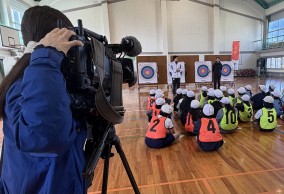 美合小学校で19日、アーチェリー体験が行われました。